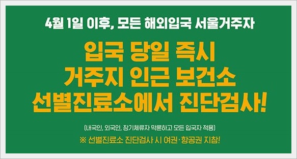 서울시에서는 코로나 확산 방지를 위해서 해외에서 입국하는 사람들을 대상으로 4월1일 이후부터 입국 당일 즉시 거주지의 보건소 및 선별 진료소에서 진단검사를 하라고 안내를 했습니다.