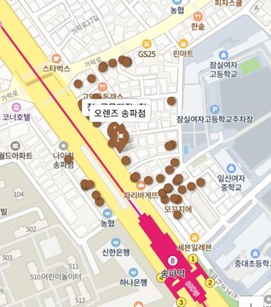 지도에 표시되어 있는 해당 지역에서 검색하기 버튼을 누르면 송파역 인근 제로 페이 가맹점들을 확인할 수가 있습니다. 가맹점은 동그란 점으로 표시되며 해당 매장을 클릭하면 자세한 정보도 확인할 수가 있습니다.