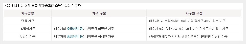 제일 궁금해 하는부분은 누가 받을 수 있는지 자신이 지원 대상인지 여부입니다. 정부에서 지원을 해주는 제도이다 보니 대상이 된다면 일정 부분의 지원금을 받을 수 있어 생활하는데 많은 도움이 되기 때문입니다. 자격요건은 총 4가지 기준에 부합되어야 합니다.
