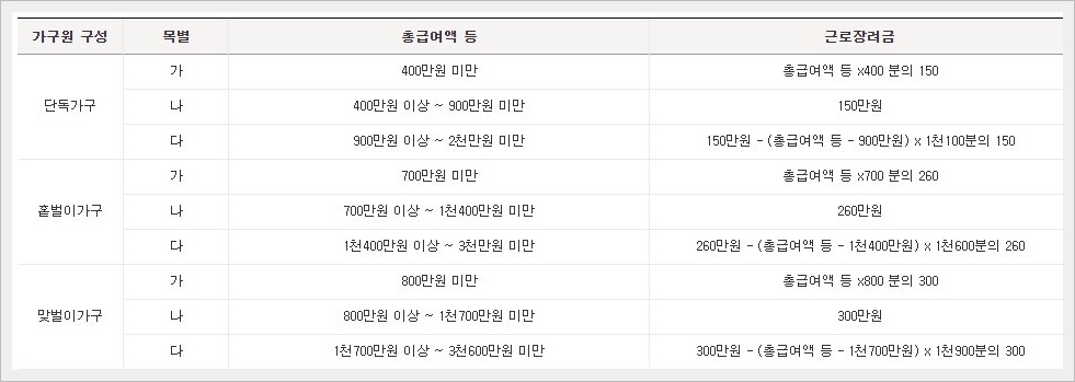 근로장려금 지급액의 경우 총소득 급여액에 따라서 가구마다 달라질 수 있습니다. 국세청 홈택스애서 근로장려금 계산하기 서비스도 제공하고 있으니 궁금하신 분들은 직접 계산해 보시길 바랍니다.