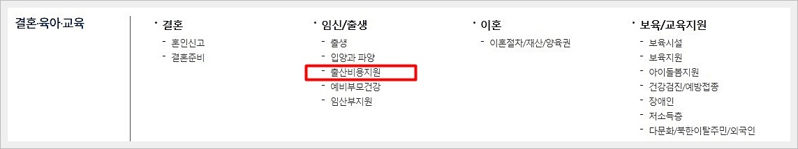 정부 24 앱을통해서 확인할 수가 있는데요. 홈페이지 접속 후 분야별 서비스 항목 중 결혼/육아/교육 카테고리를 들어가면 보시는 바와 같이 출산비용 지원이라는 안내를 찾을 수 있습니다. 해당 페이지에 들어가면 전국의 지역별로 정리된 출산지원금에 대한 내용을 확인할 수가 있는 것입니다.