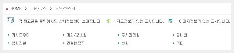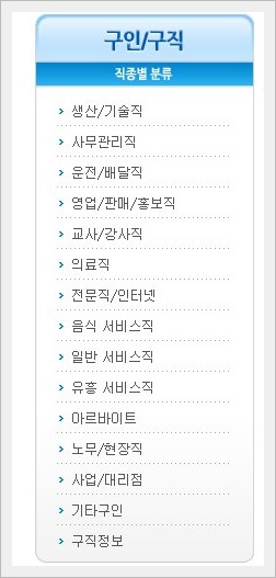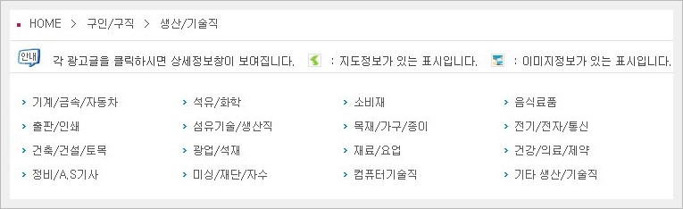 구인구직 게시판을 살펴보면 생산/기술직, 사무/관리직, 운전 /배달직, 교사, 전문직, 일반 서비스 등 다양한 업종별로 취업정보가 구성되어 있는 것을 알 수 있습니다. 이처럼 직업군별로 카테고리가 구분되어 있기 때문에 보다 손쉽게 자신이 관심 있어하는 일자리 정보를 찾기도 수월합니다.