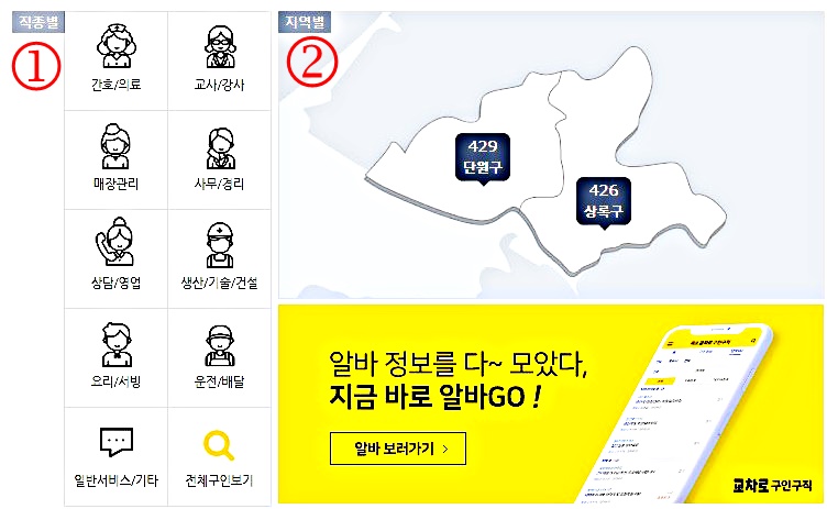 그렇다 보니 안산지역 내에서도 단원구가 보다 발전한 것을 알수 있습니다. 일자리 또한 단원구에 많이 밀집되어 있는 경향을 나타내고 있는 만큼 안산 교차로 홈페이지에서 직업 검색 시 단원구 쪽을 집중적으로 알아보시는 것이 좋습니다.