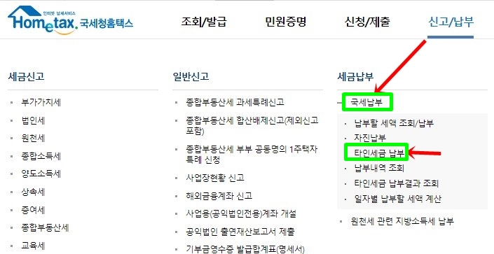 홈택스에 접속한 후 신고/납부 카테고리에서 국세납부 → 타인세금납부 카테고리로 들어가면된다.