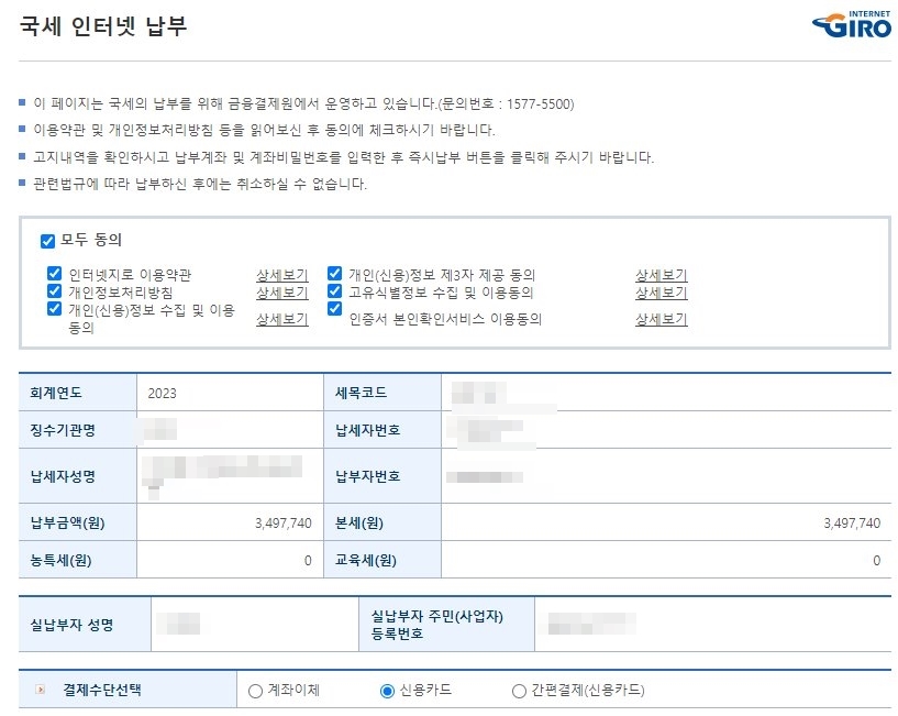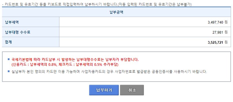 국세청 홈택스에서 신용카드를 선택해서 납부하게 되면 납부대행 수수료가 어느정도 되는지 총 납부금액을 확인할수 있다.