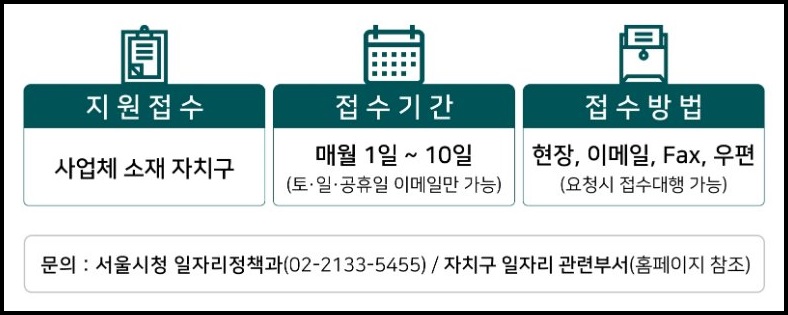 서울시에서 지원하는 지원내용은 급여에 관계없이 1일 2.5만원을 기준으로 월 최대 50만 원 까지 받을 수 있습니다. 한 사업장에서 1명~2명까지 되는 만큼 50만 원에서~100만 원 까지 지원을 받을 수 있습니다.