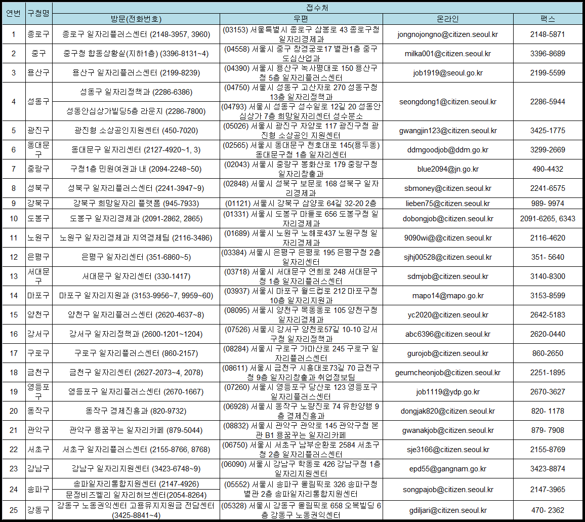 서울시 25개 자치구 접수처는 아래와 같으니 참고하시기 바랍니다.